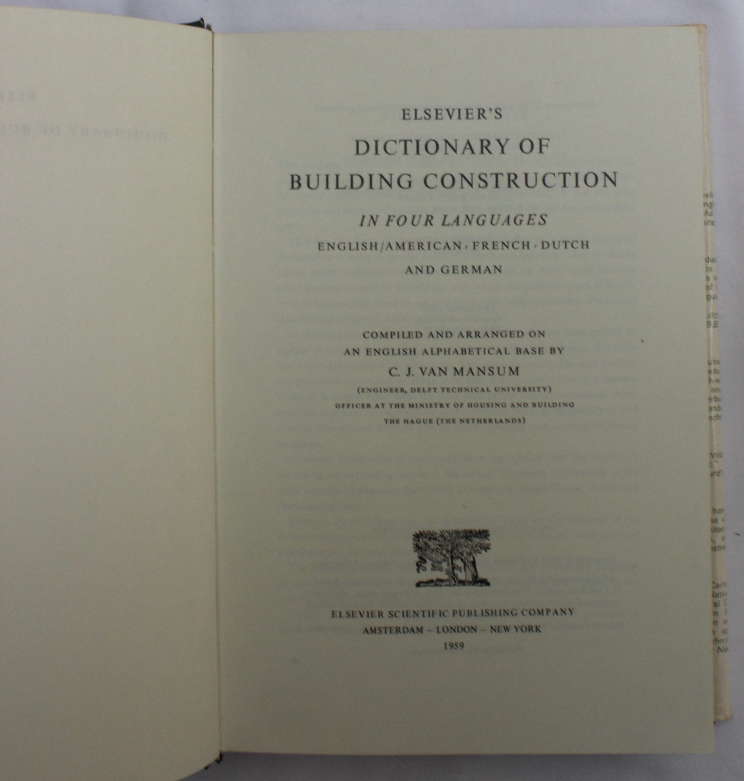 Nearly 8500 terms used in the building trade by contractors and architects, as well as tradesmen and office personnel, are included in this dictionary. Entries are arranged on an English alphabetical basis. They cover all building materials, tools and technical expressions used in the construction trade. The corresponding terms in French, Dutch and German are arranged horizontally across the page.