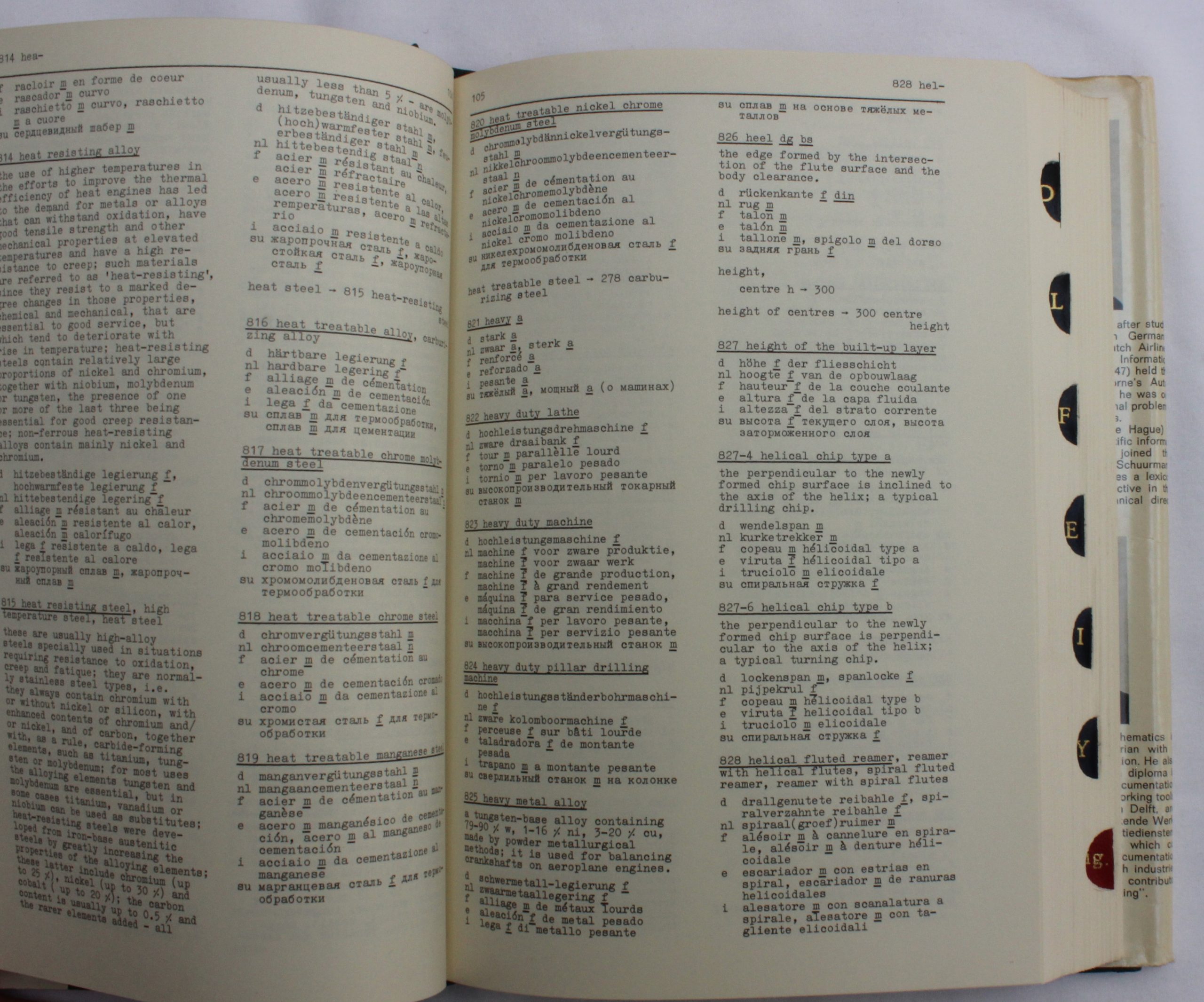 “In the field of machine tools, great confusion exists as regards terminology. Many frequently used and apparently equivalent terms are differently defined in the various languages, and in some languages words are not spelled consistently. In view of this situation, it was not possible for the editors to limit themselves to a straightforward inventory of these terms. In the interests of clarity they felt themselves obliged to supply for most terms a definition in English and, in the case of a number of standard tools, to go further and show their geometrical form by means of an illustration. In this way, the dictionary has almost unintentionally taken on an encyclopedic chracter.”