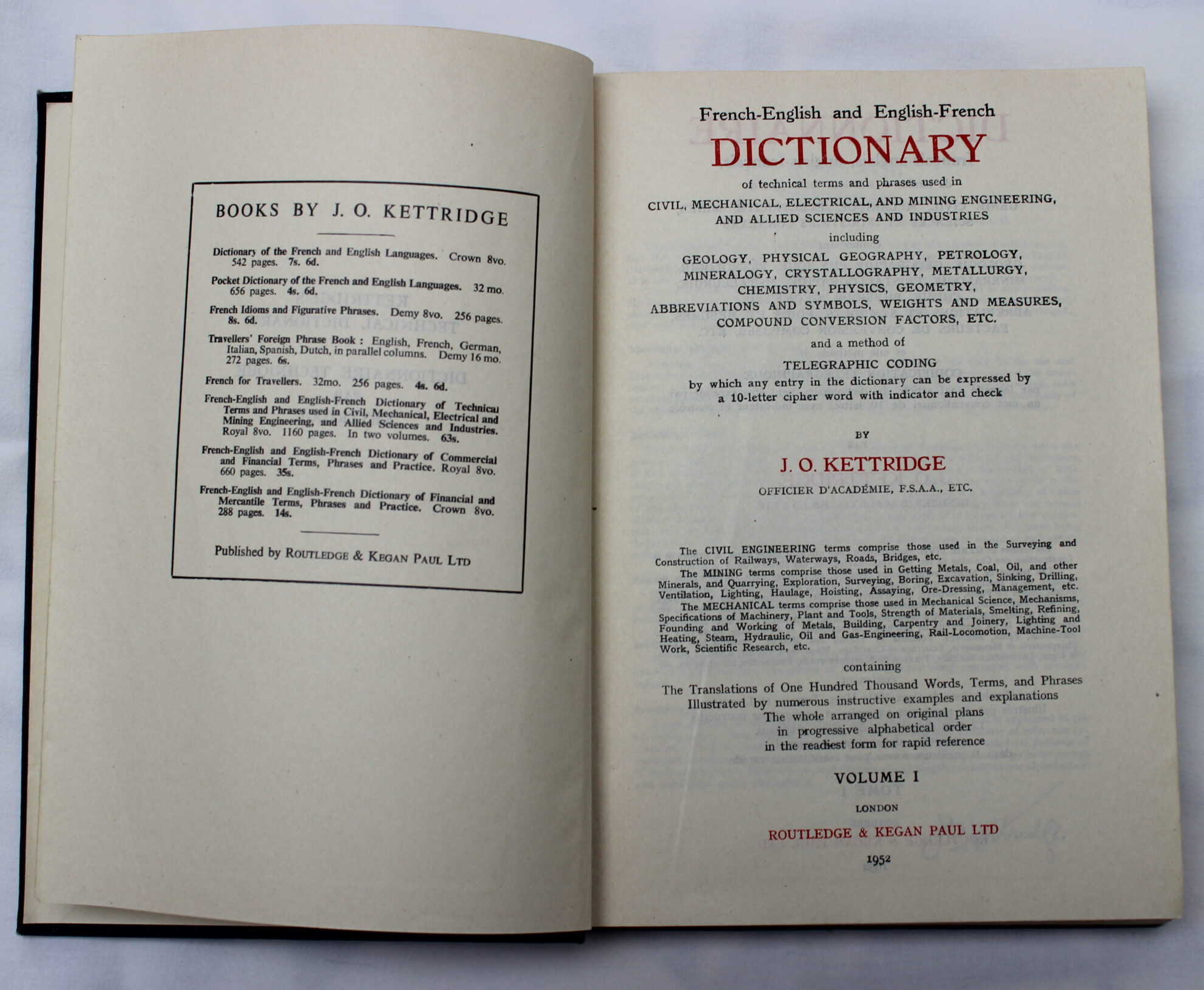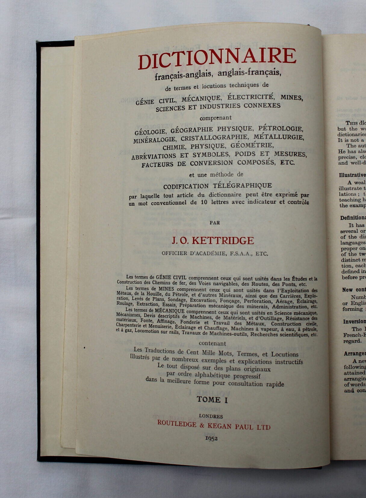 Kettridge’s Technical Dictionary – Dictionnaire Technique par Kettridge – Dictionnaire anglais-français et anglais-français de termes et locutions techniques de génie civil, mécanique, électricité, mines, sciences et industries connexes comprenant géologie, géographie physique, pétrologie, minéralogie, cristallographie, métallurgie, chimie, physique, géométrie, abréviations et symboles, poids et mesures, facteurs de conversion composés et une méthode de codification télégraphique – 2 Tomes (complet), French-English and English-French Dictionary of Technical Terms and Phrases Used in Civil, Mechanical, Electrical, Engineering, and Mining Engineering, and Allied Sciences and Industries including Geology, Physical Geography, Petrology, Mineralogy, Crystallography, Metallurgy, Chemistry, Physics, Geometry, Abbreviations and Symbols, Weights and Measures, Compound Conversion Factors etc. and a method of telegraphic coding by which any entry in the dictionary can be expressed by a 10-letter cipher word with indicator and check.