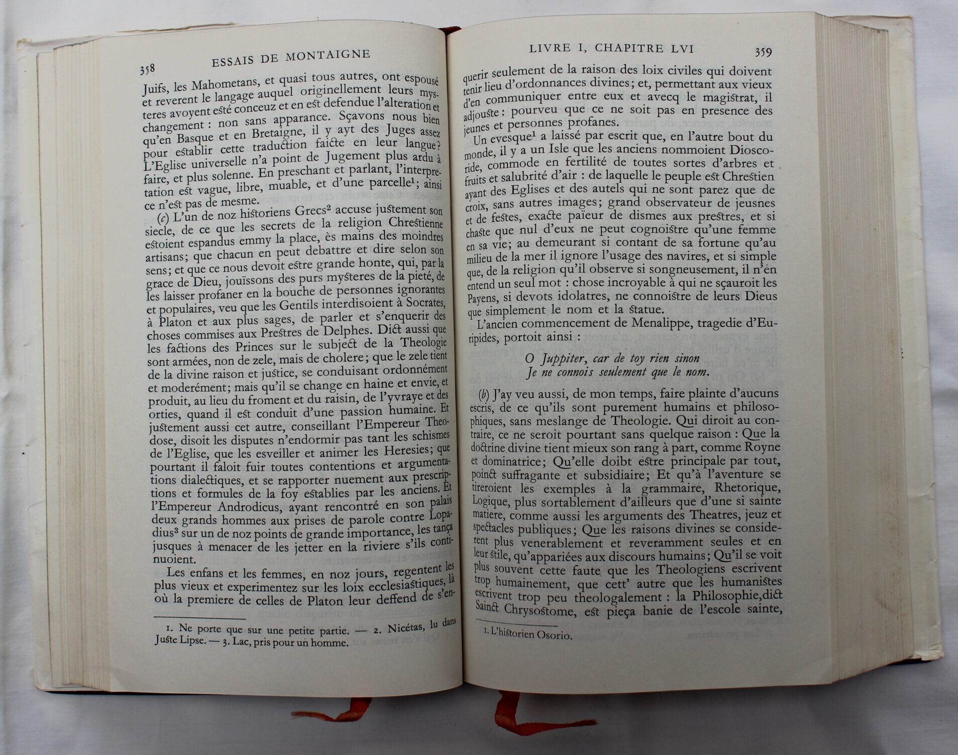 Texte établi d’aprés l’examplaire de Bordeaux, variantes de 1580 a 1595, ratures du manuscrit, notes, éclaircissements traductions des citations, chronolgie de la vie et de l’œuvre de Montaigne, bibliographie