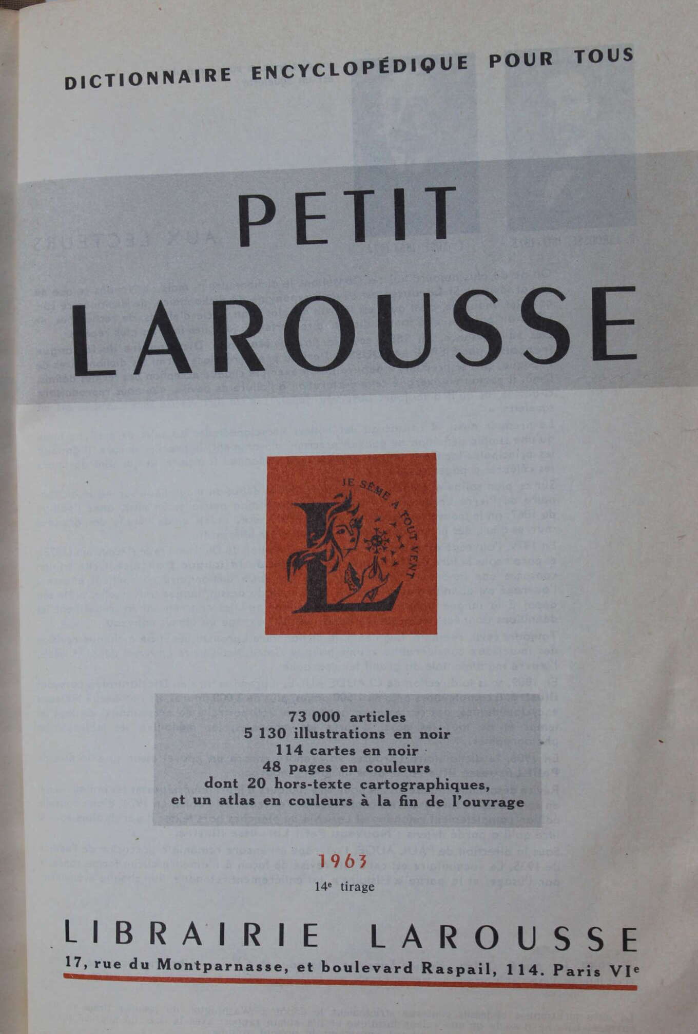 Une cartographie absolument nouvelle, de très nombreux portraits et reproductions d’œuvres d’art, des exemples et des définitions inspirés des grands auteurs contemporains, enfin les fameuses “pages roses” concourent à faire du PETIT LAROUSSE le plus complet et le plus répandu des dictionnaires français en un volume, véritable “mémoire” infaillible de chacun de nous, le livre utile par excel-lence, dont la spécialité est de n’en avoir pas, puisqu’il est, à proprement parler, UNIVERSEL.