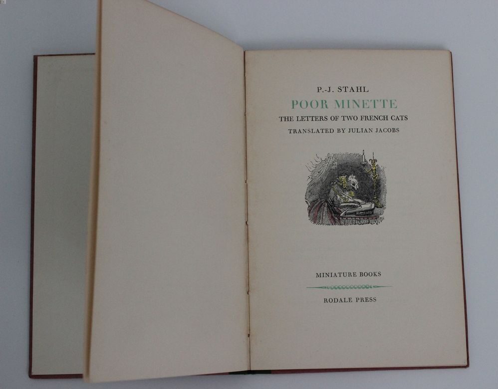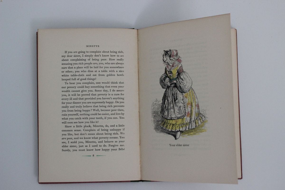 By P-J Stahl, translated by Julian Jacobs. A childrens book with beautiful illustrations featuring the charming story of Minette, the beautiful but unhappy cat whose adventures are of a thoroughly sophisticated kind. First edition of English translation featuring original 19th century illustrations.