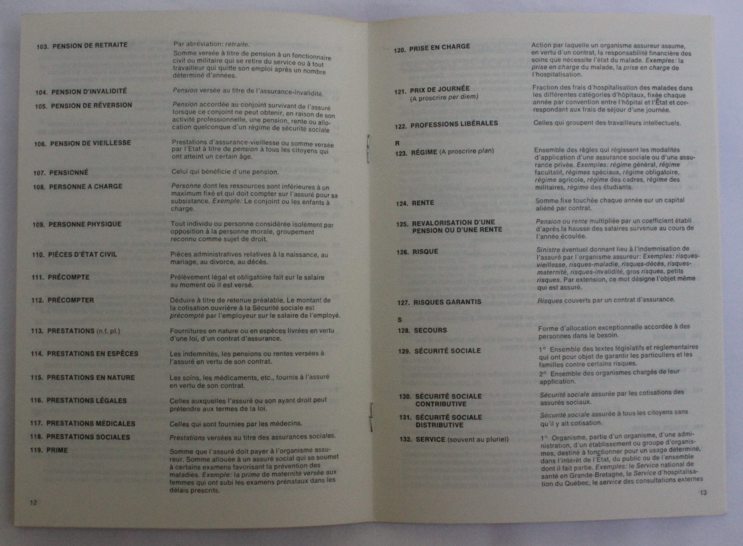 A une époque où les assurances sociales prennent, dans la vie de chacun, une importance grandissante, le besoin se fait vivement sentirde choisir, sans plus attendre, les termes qui respectent à la fois la langue et la réalité qu’ils sont appelés à désigner, et de barrier ainsi la route aux anglicismes et aux néologismes qui alourdissent la langue sans vraiment l’enrichir.”